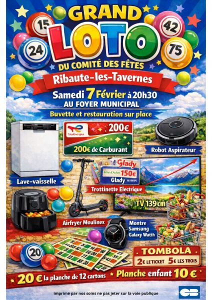 Le comité des fêtes de Ribaute Les Tavernes organise son loto le samedi 7 février au foyer socio-éducatif du village.